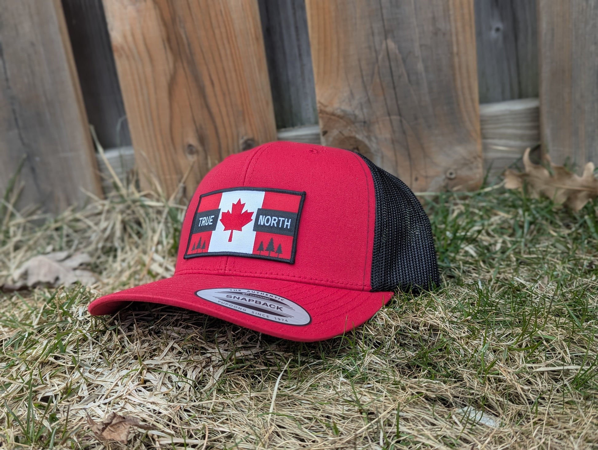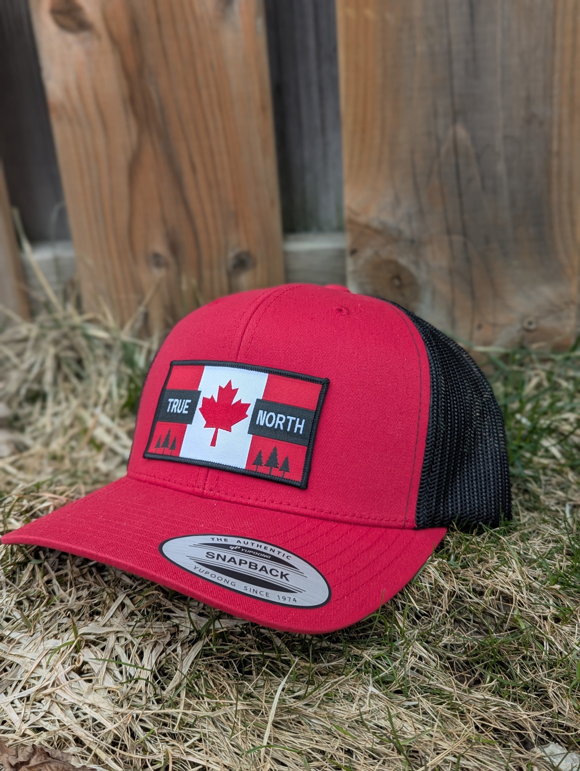 Bold, patriotic, and built for the outdoors. This red and black snapback features a clean embroidered patch with the maple leaf and evergreens—perfect for repping the North in style.